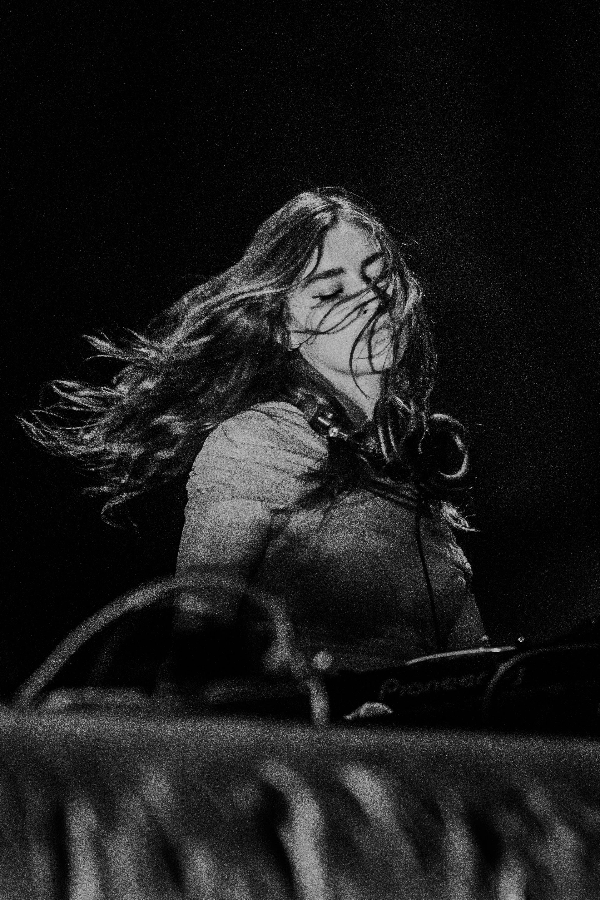 A woman with long hair dancing or performing as a DJ, with her hair flowing and eyes closed, in a black and white photo.