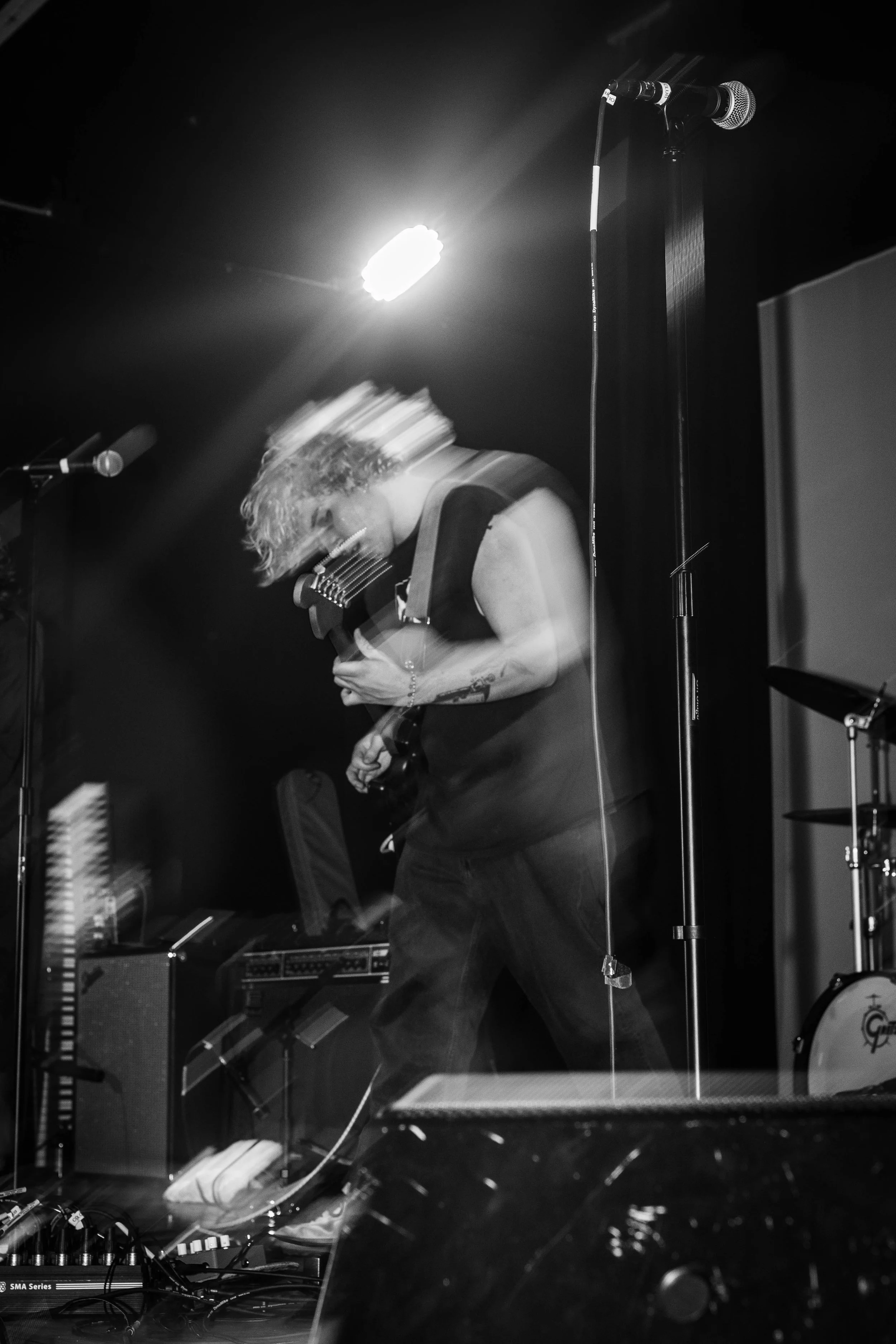 A black and white image of a person with curly hair playing an electric guitar on stage, with a microphone and amplifier nearby.